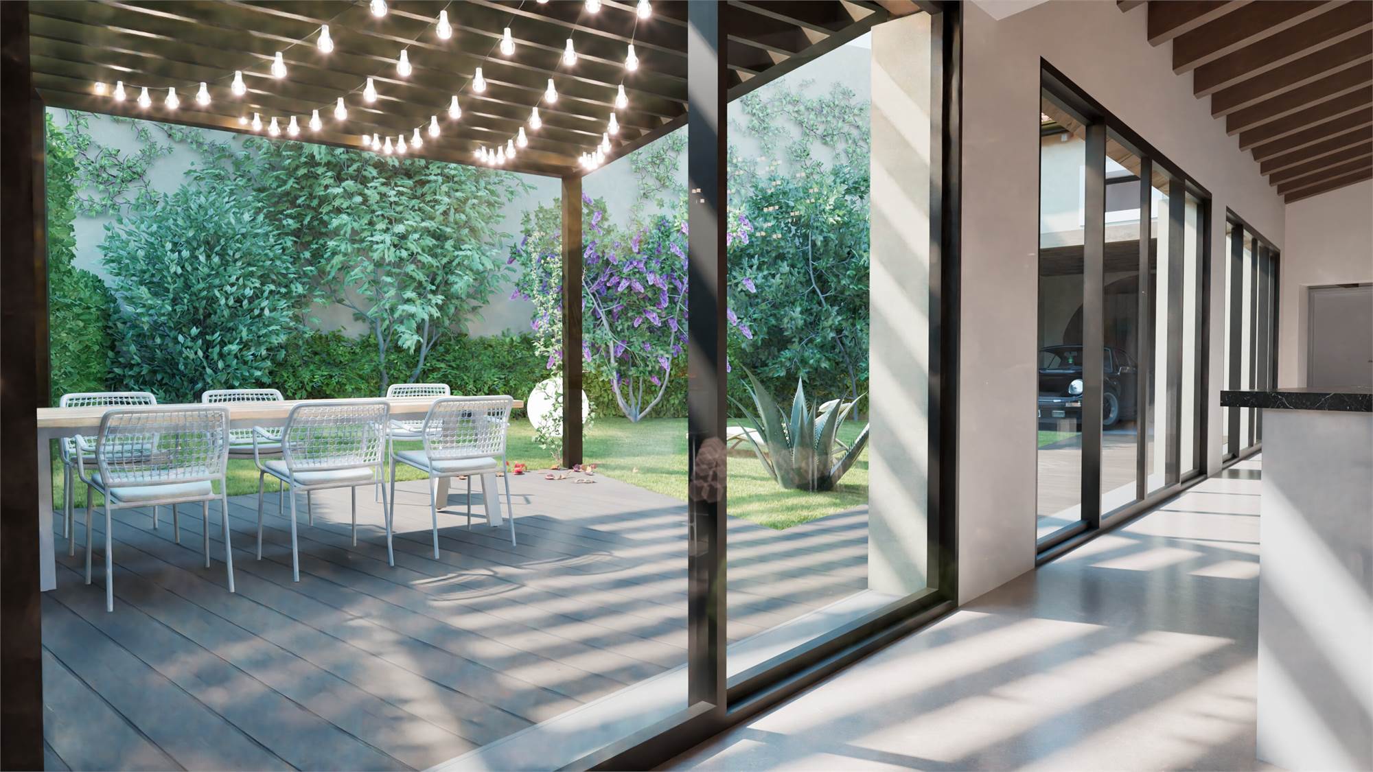 Un appartamento su due livelli, ricco di fascino grazie alle sue grandi vetrate e al raffinato portico coperto, perfetto per vivere gli spazi esterni in ogni stagione.