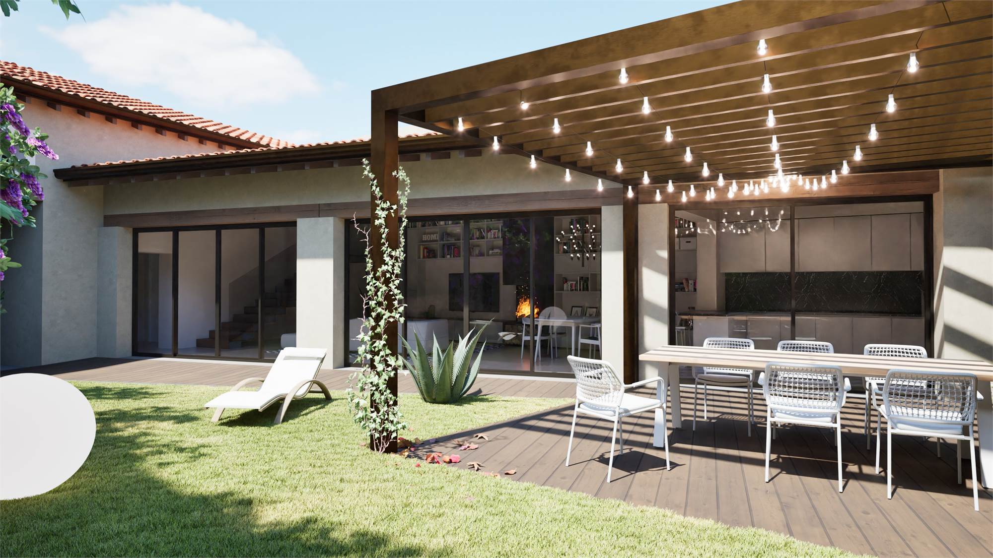 Al piano terra, il soggiorno di quasi 50 m² è il cuore dell’abitazione: uno spazio scenografico con ampie aperture che affacciano sulla corte e sul portico.